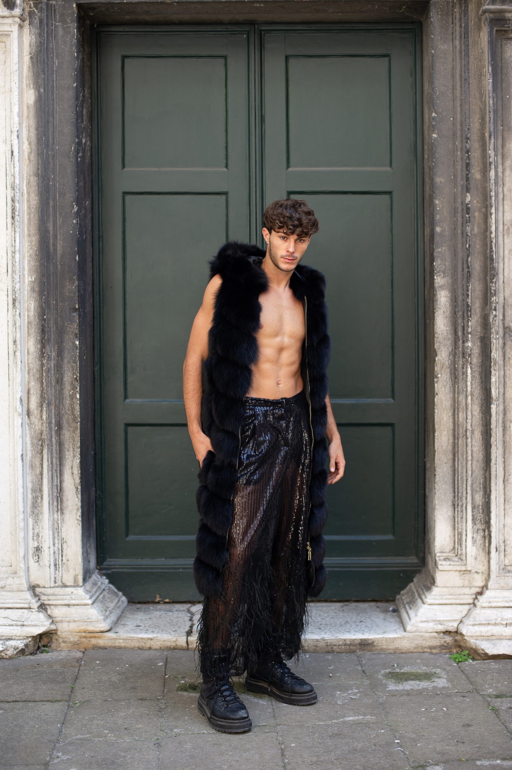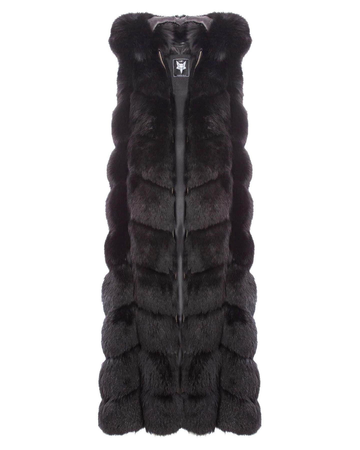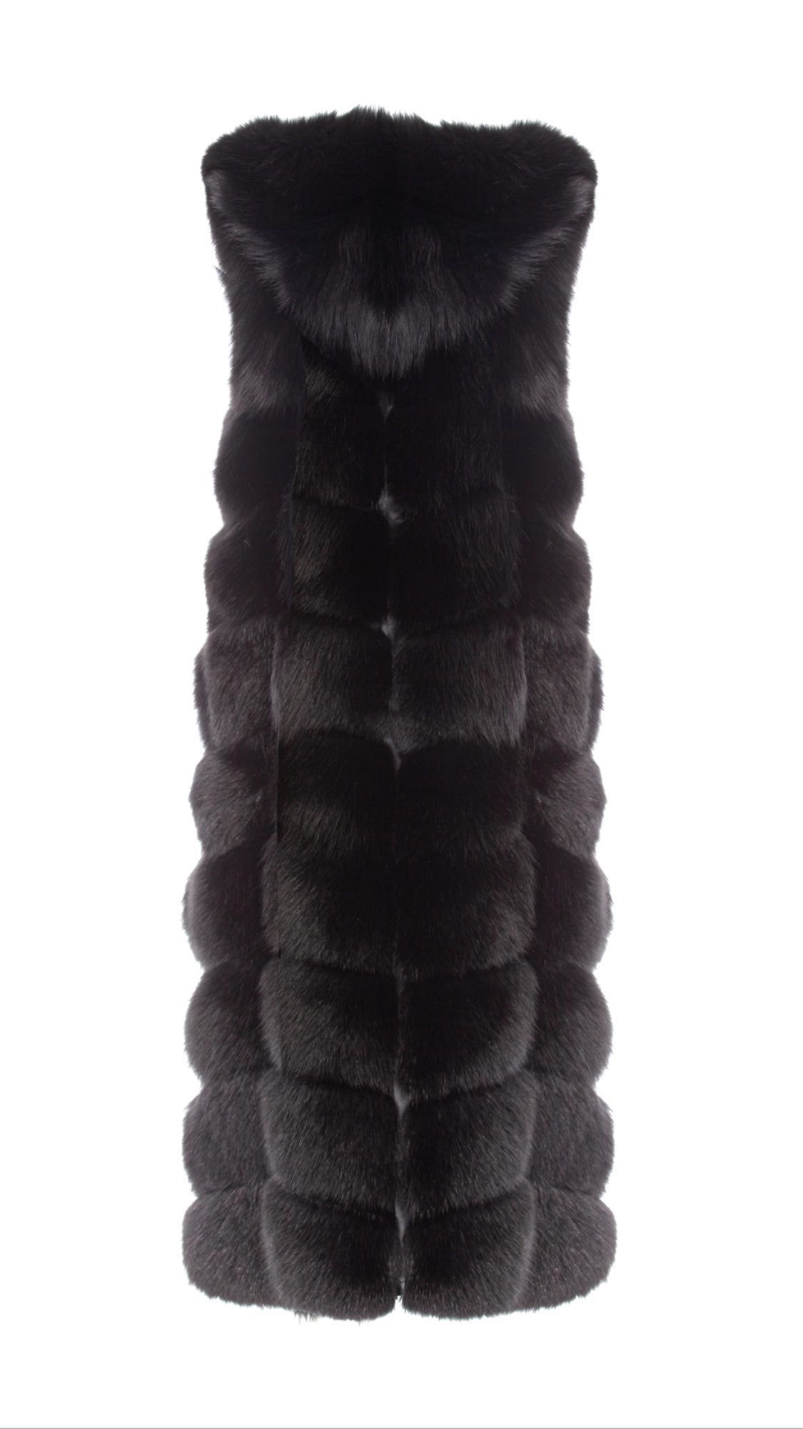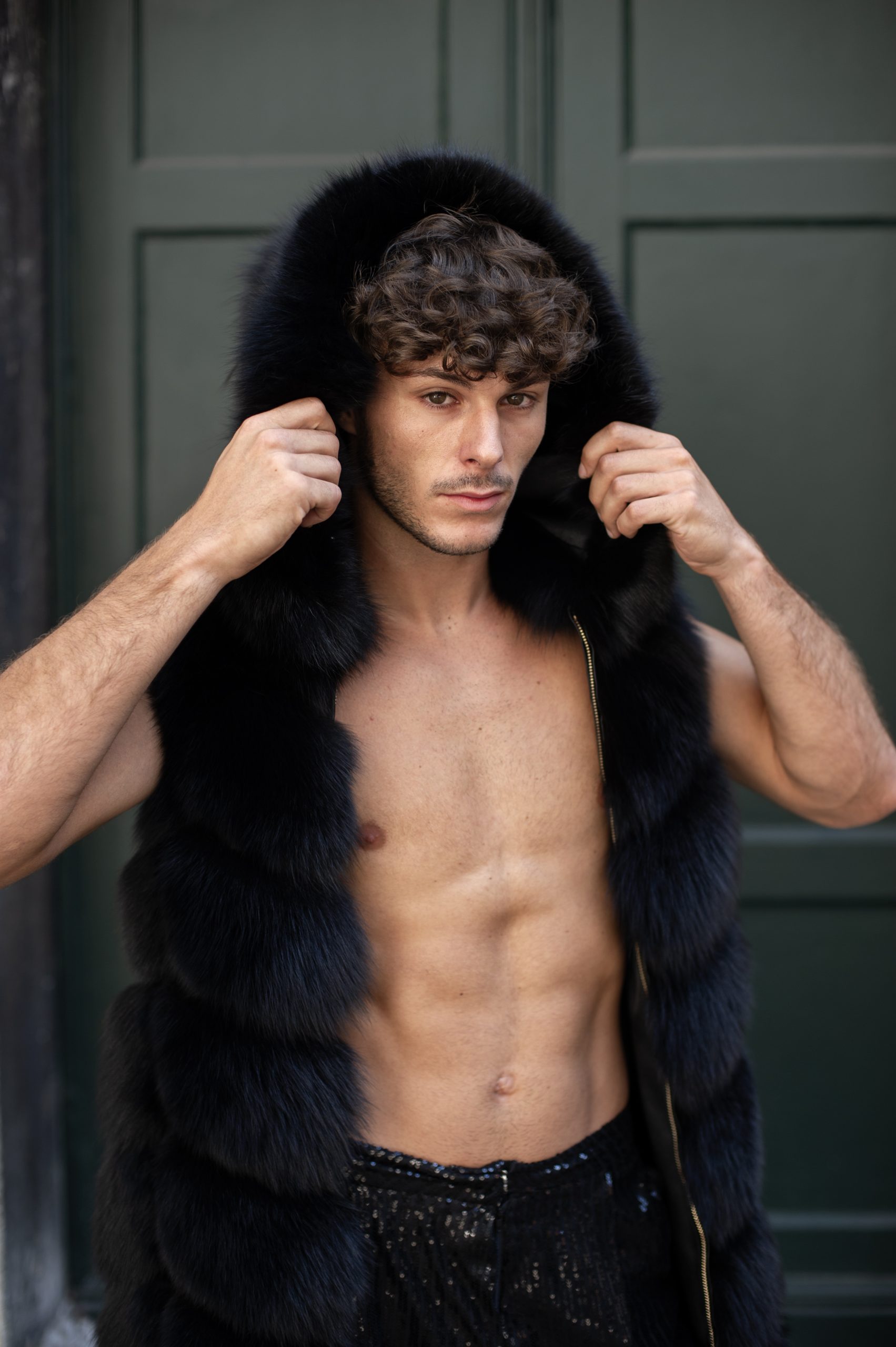 Long men’s gilet in luxurious black fox fur with natural leather finishes. Features a removable hood for versatile elegance.