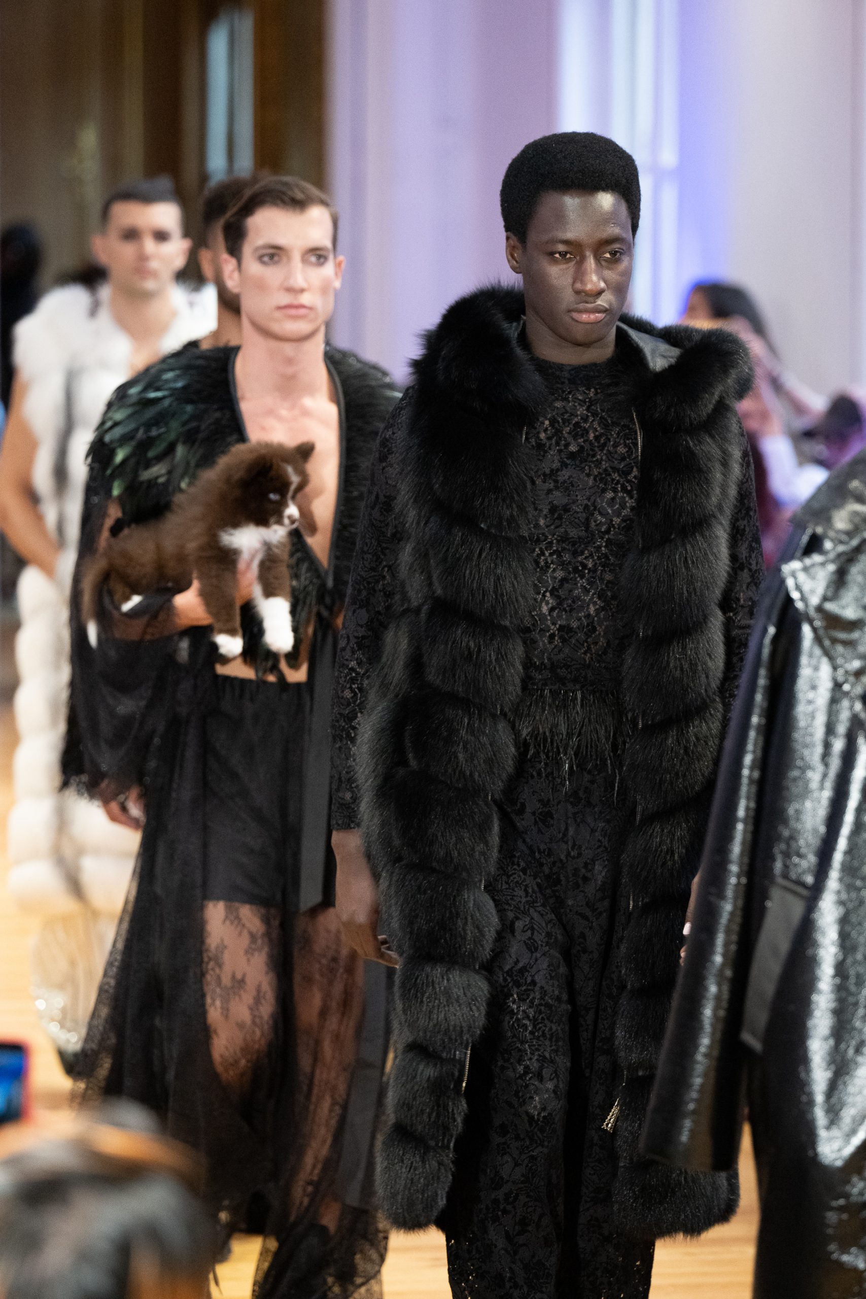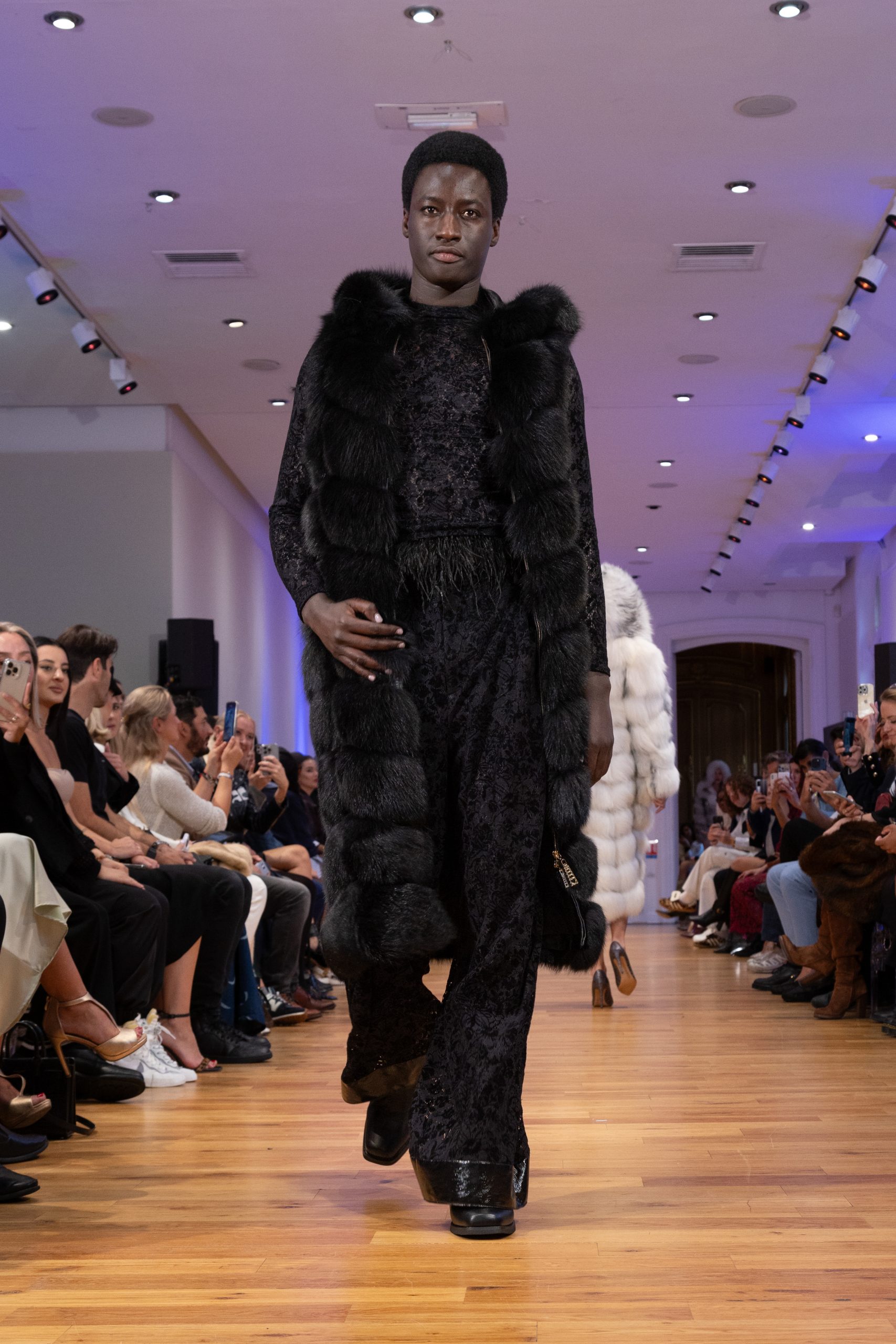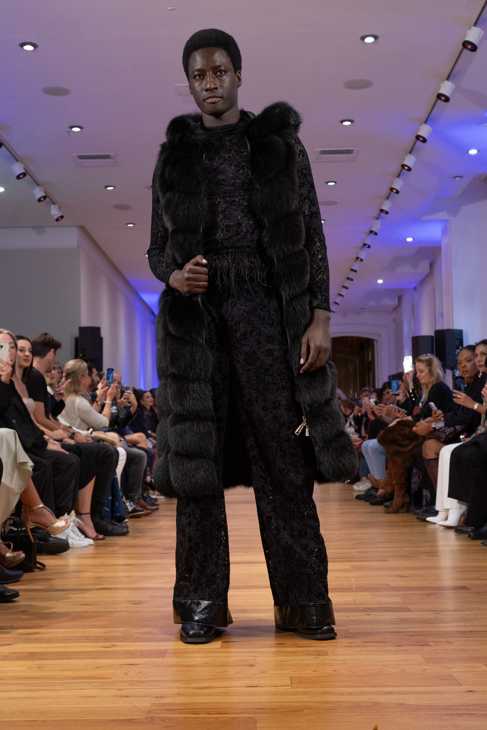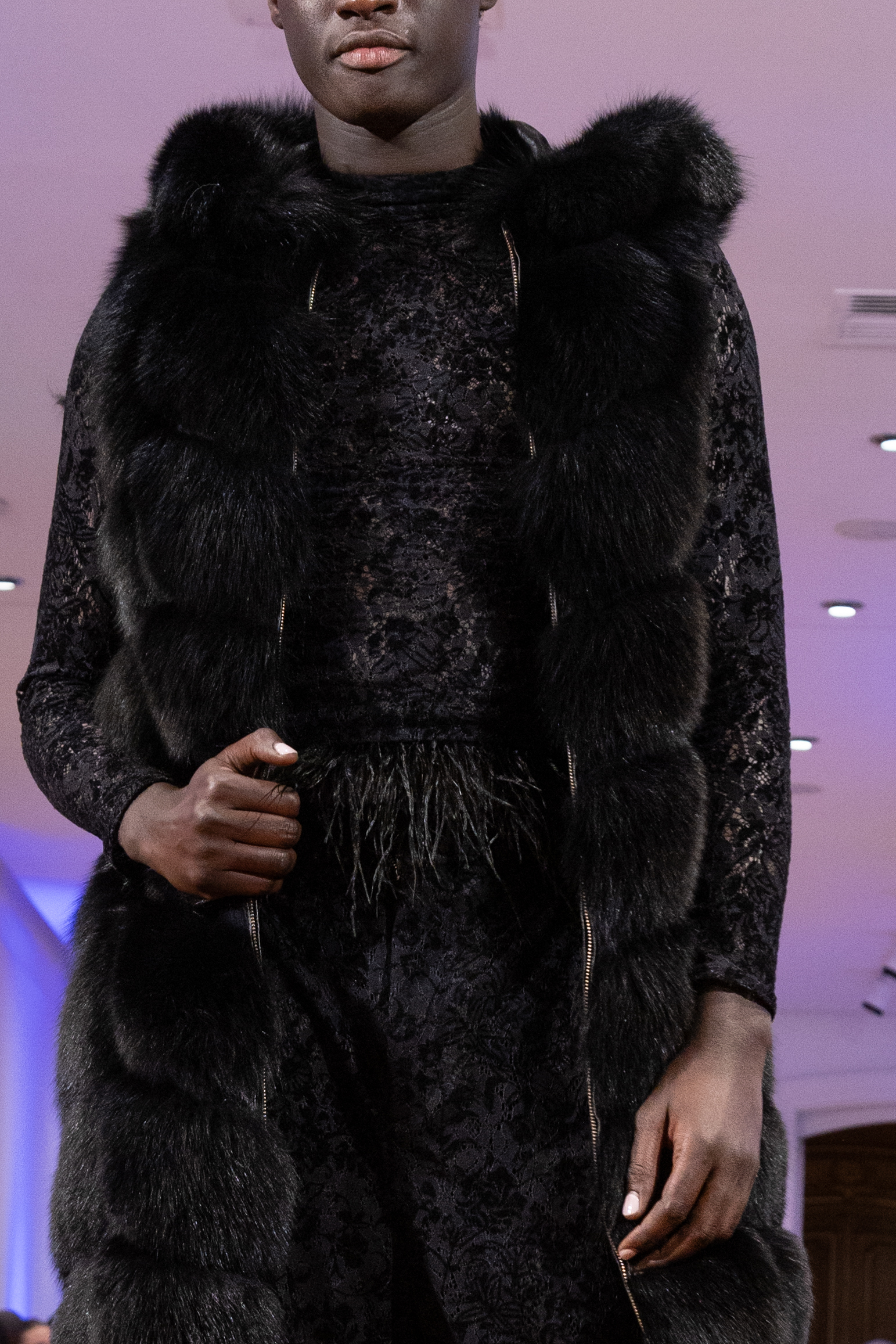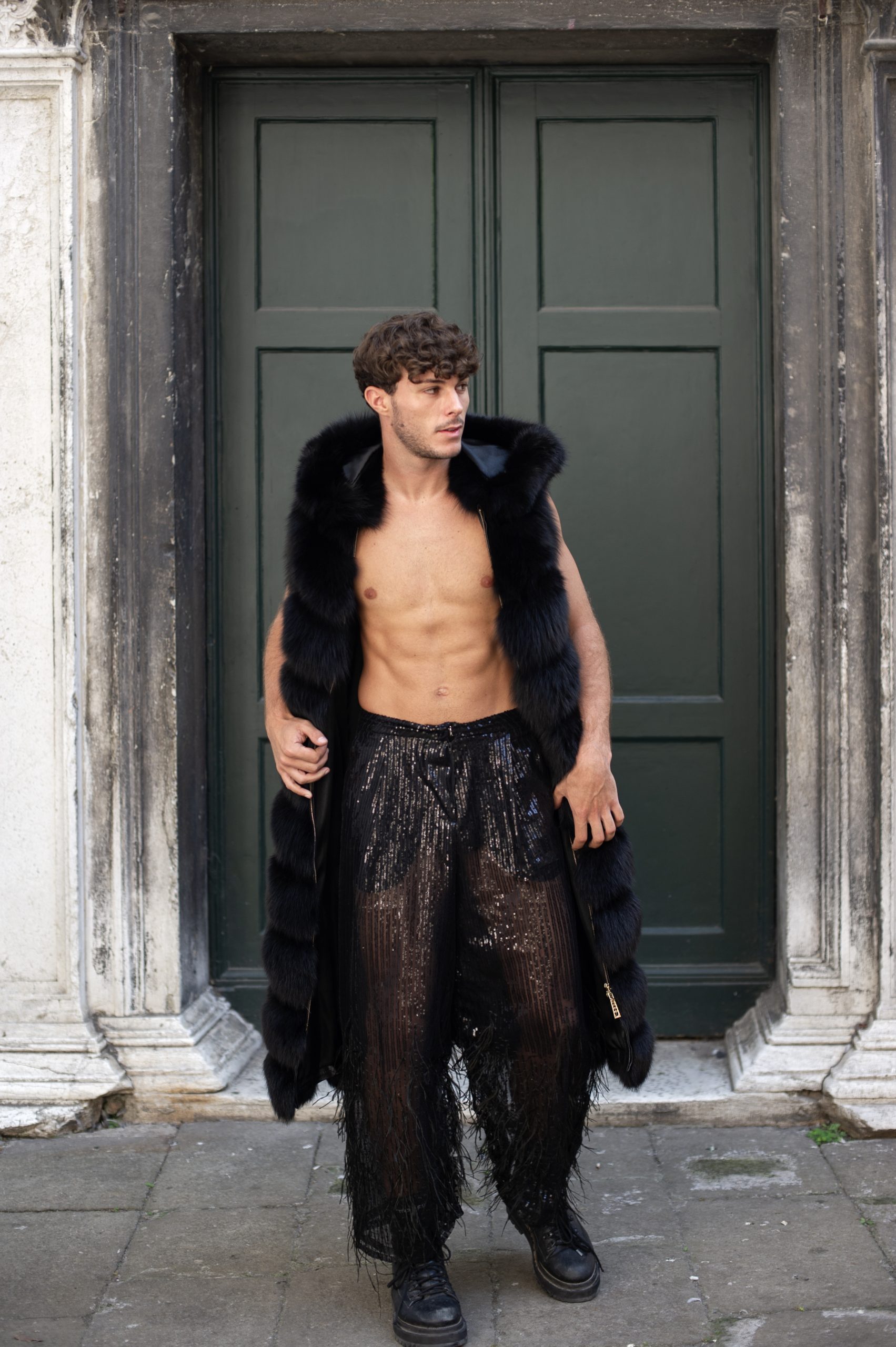 Long men’s gilet in luxurious black fox fur with natural leather finishes. Features a removable hood for versatile elegance.