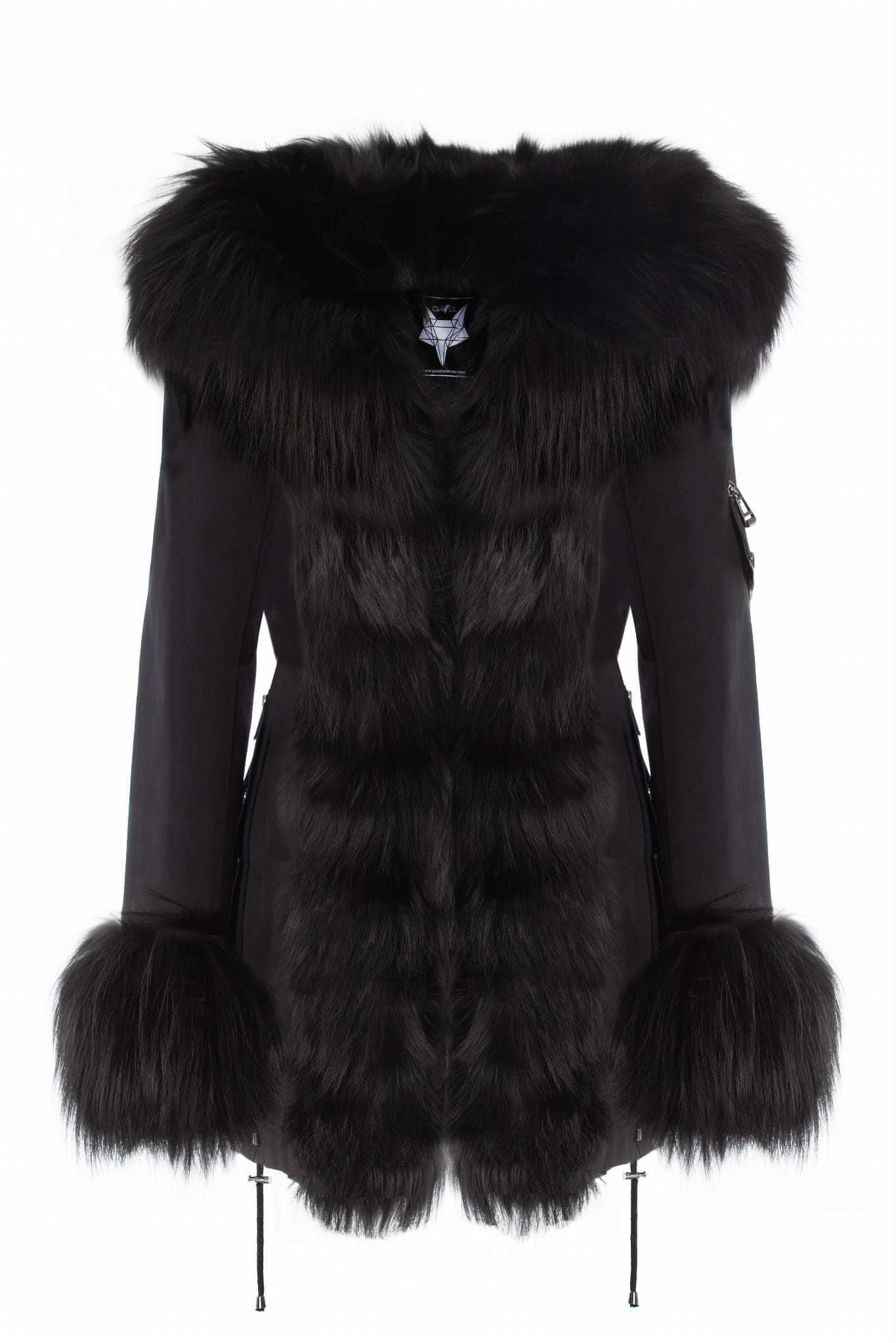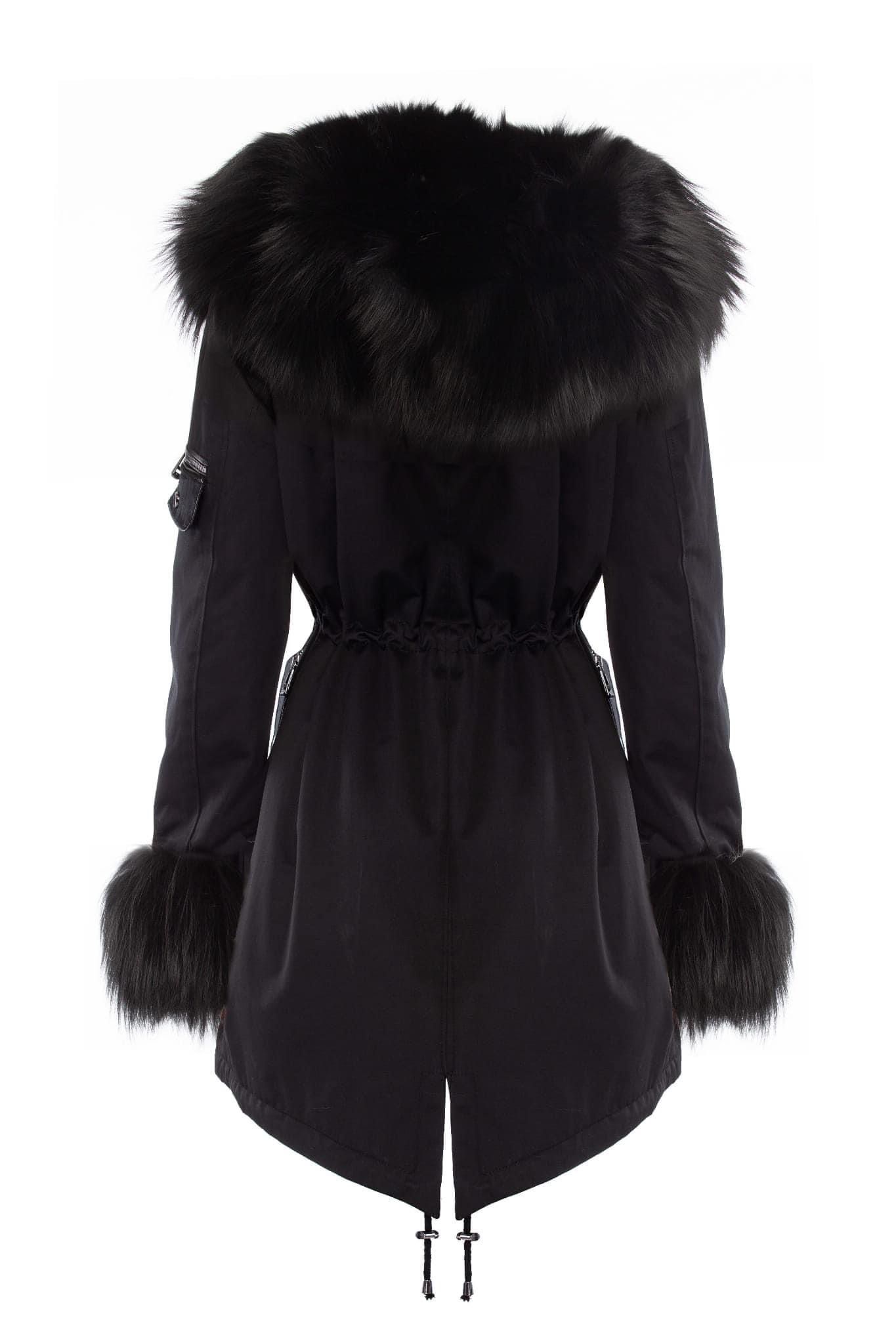 Black winter parka with a fitted silhouette, featuring black fox fur on removable sleeves, zipper, and hood. Combines warmth with refined sophistication.