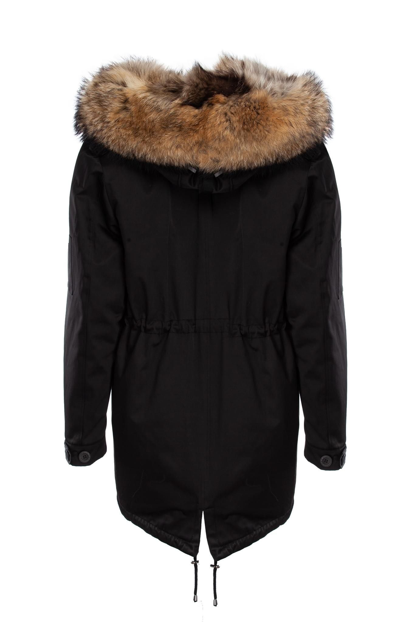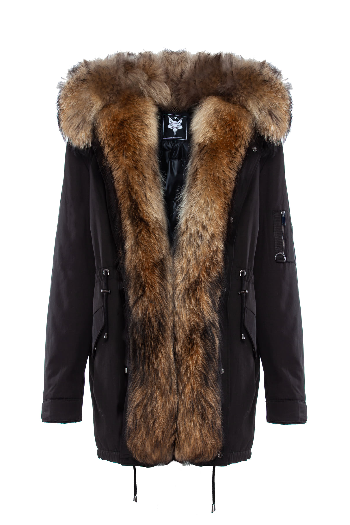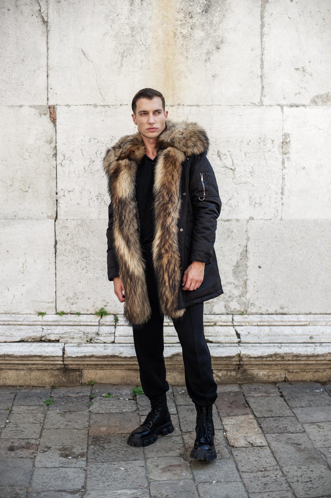 Men’s winter parka with rich raccoon fur running down the front and along the removable hood. Combines warmth with refined sophistication.
