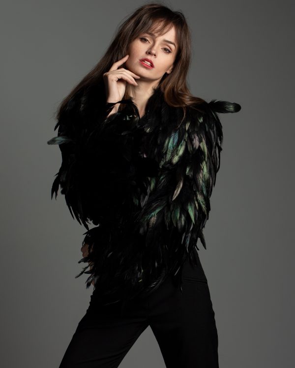 Jacket with a unique structure of rooster and ostrich feathers. Fully lined in black silk satin for elegance and comfort.