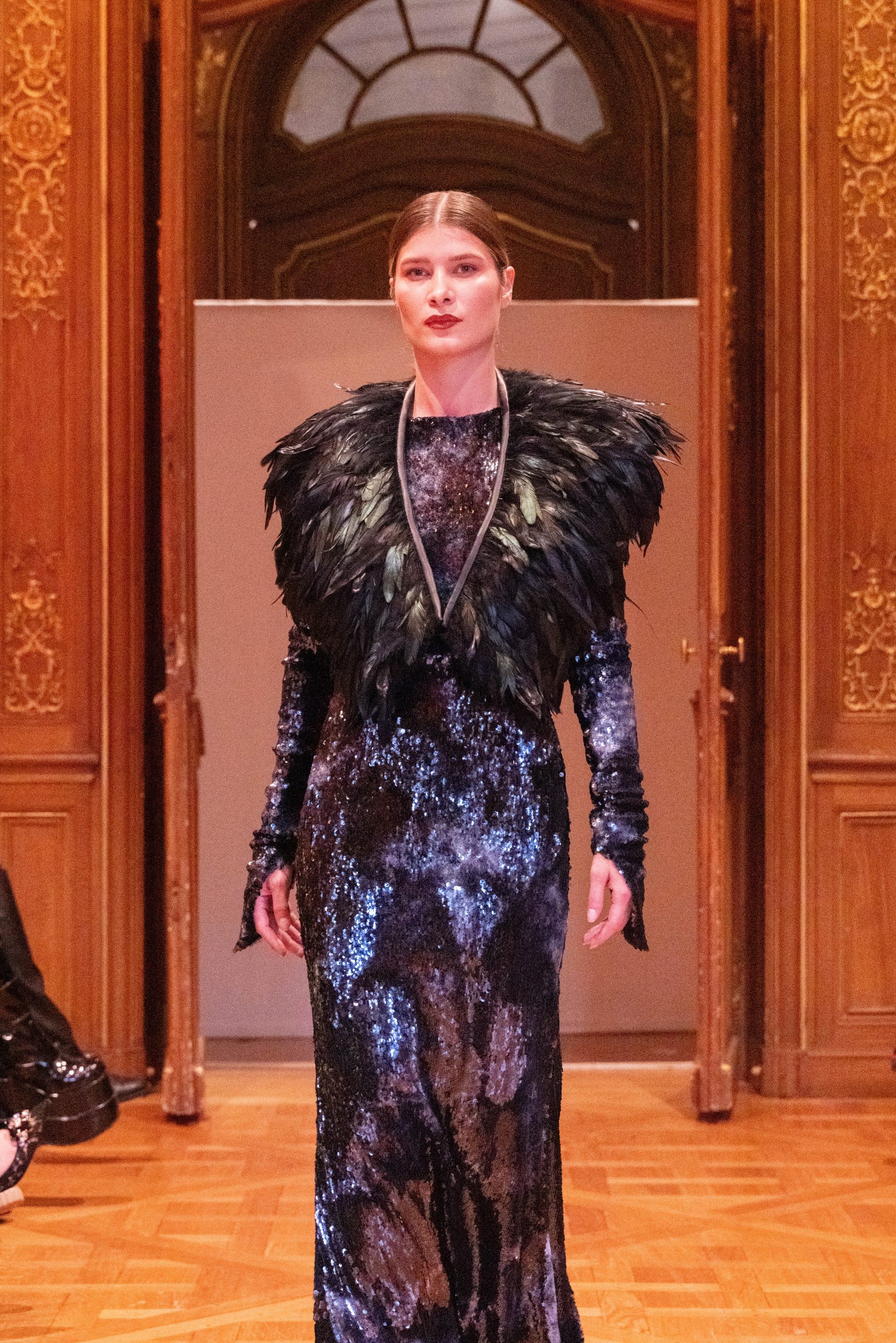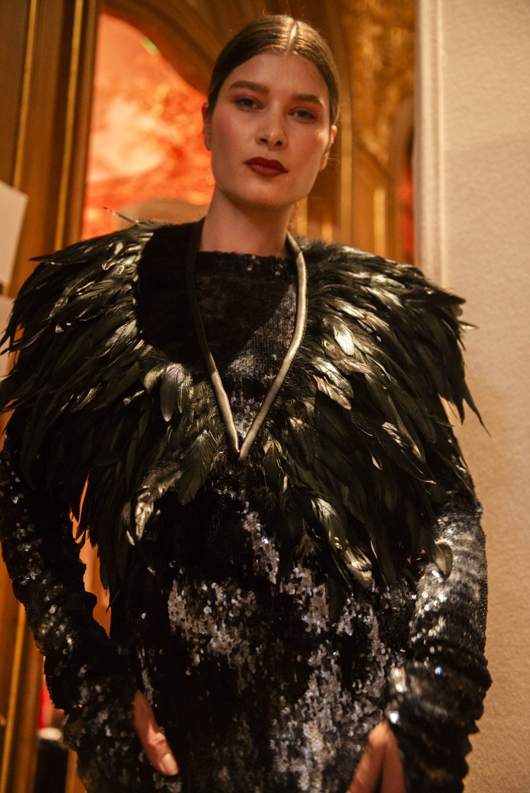This statement collar features a mix of green and black rooster and ostrich feathers, offering a sculptural and elegant silhouette. Lightweight and meticulously handcrafted, it adds refined detailing to any ensemble. Part of "The Poison Garden" collection by GAVEL PARIS.