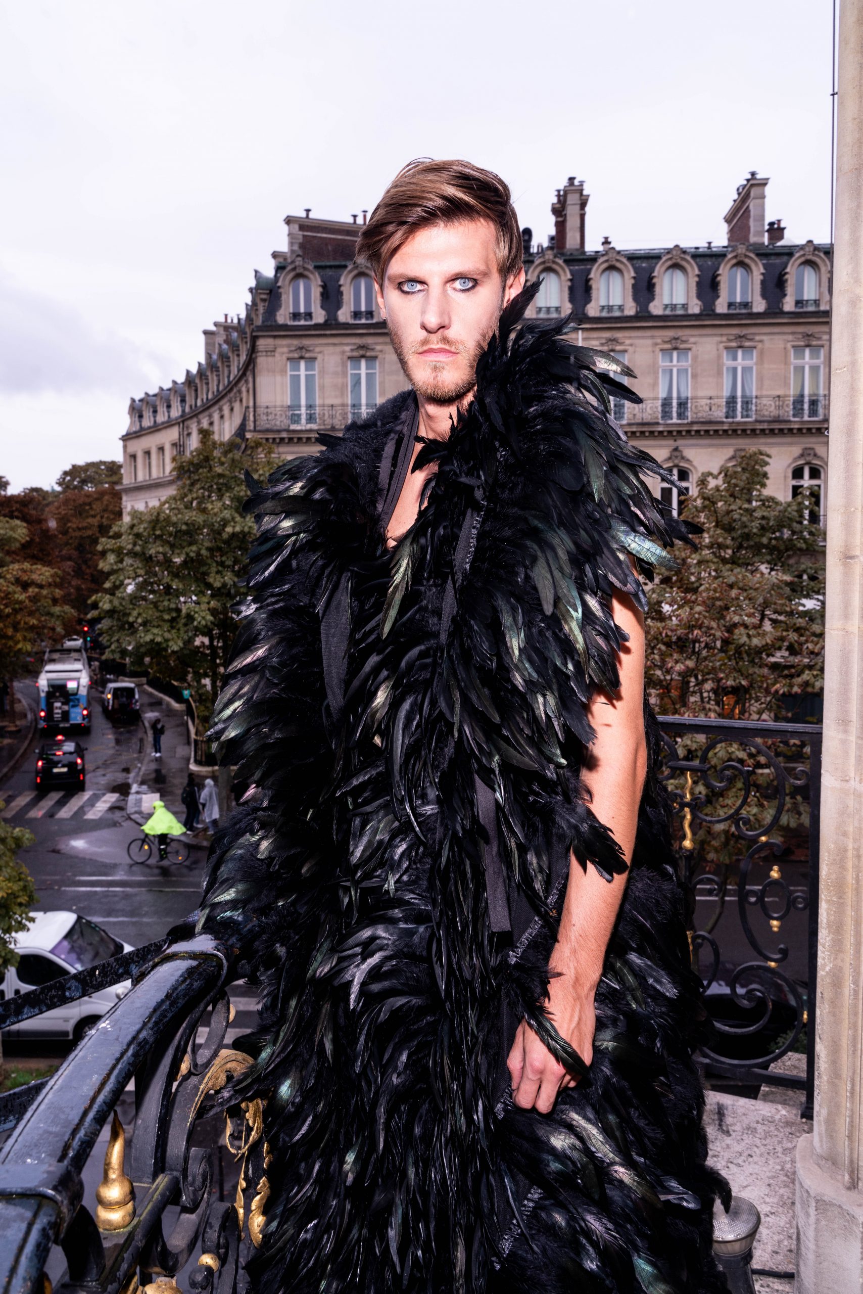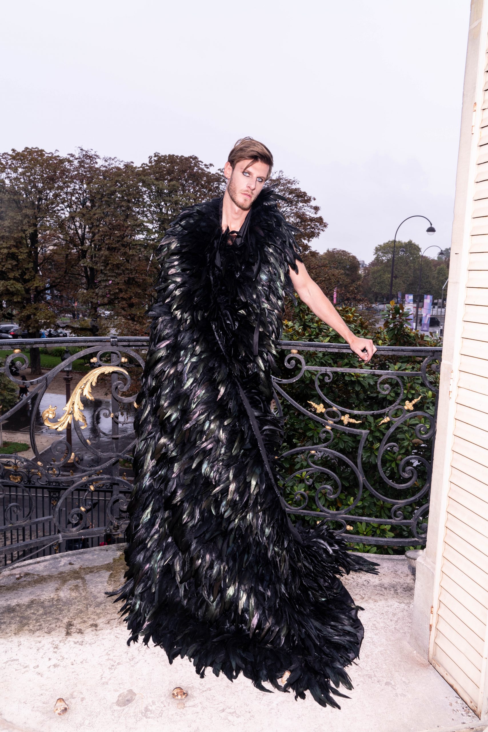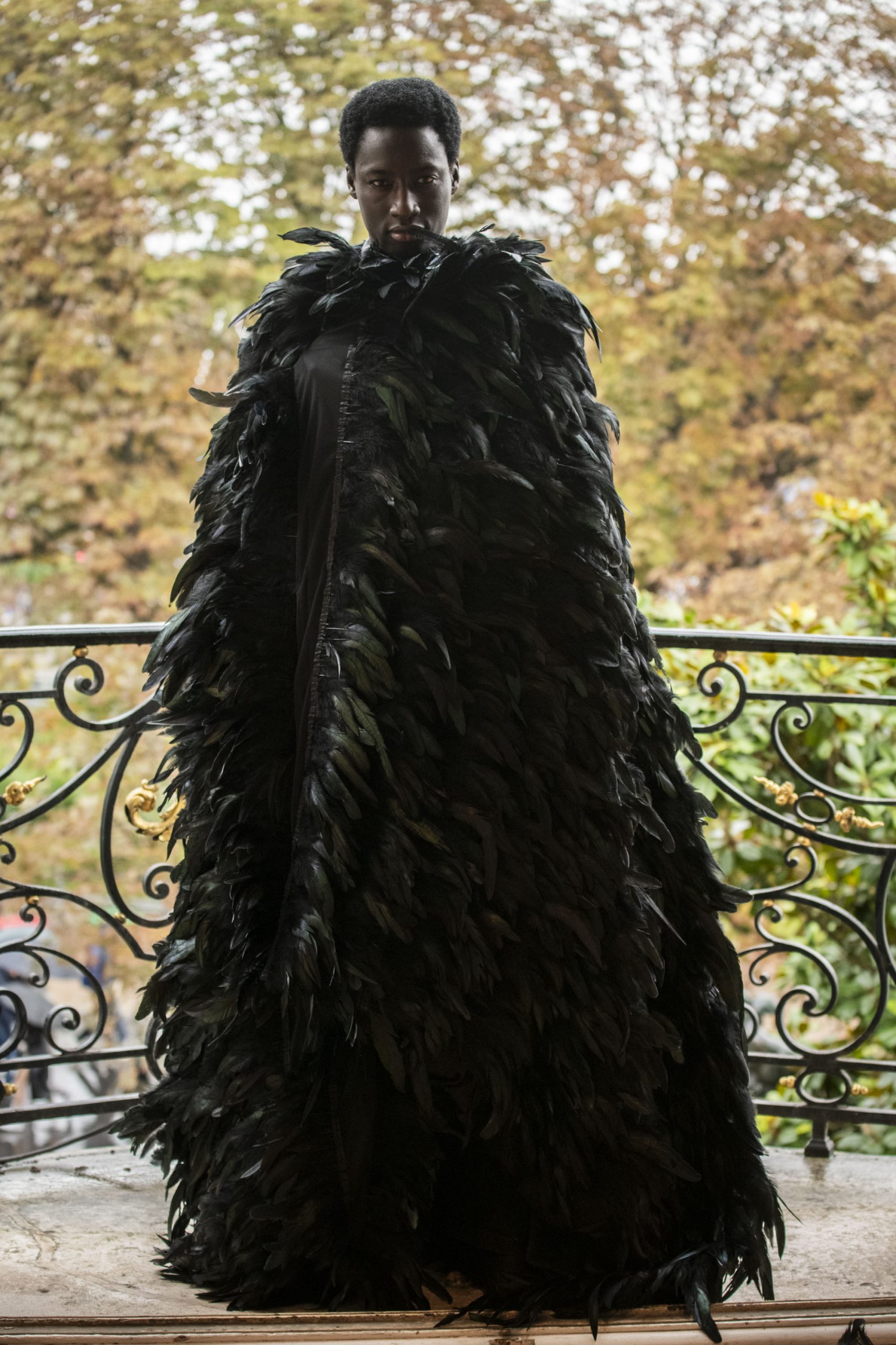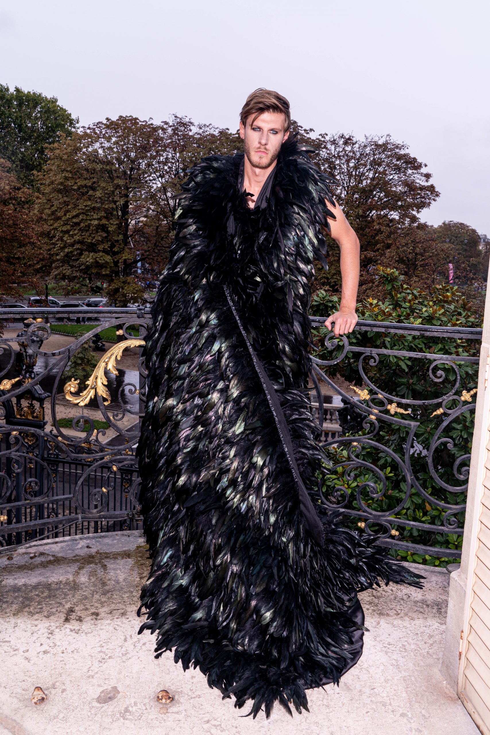 This feathered cape features a bold design crafted from rooster and ostrich feathers for a striking masculine silhouette. Lined with black silk satin, it balances lightness with elegance. Finished with a refined cut, making it a statement piece from GAVEL Paris’s "The Poison Garden" collection for men.