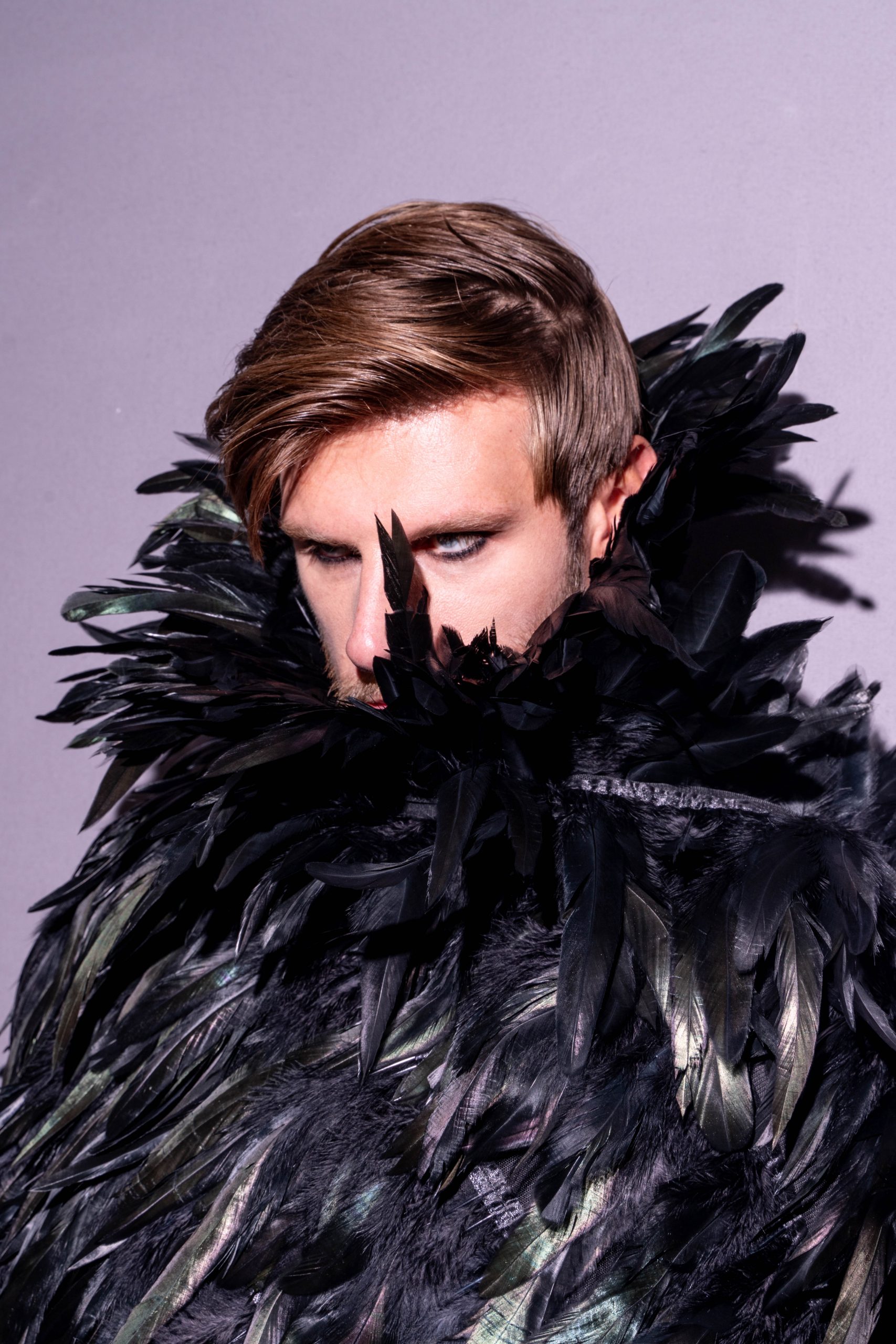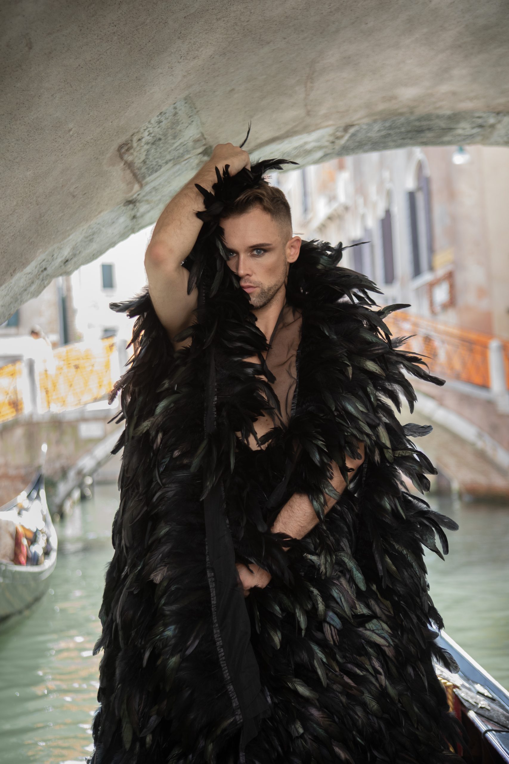 Kent feathered cape in rooster and ostrich feathers, lined with black silk satin. A bold statement piece from "The Poison Garden" collection for men.