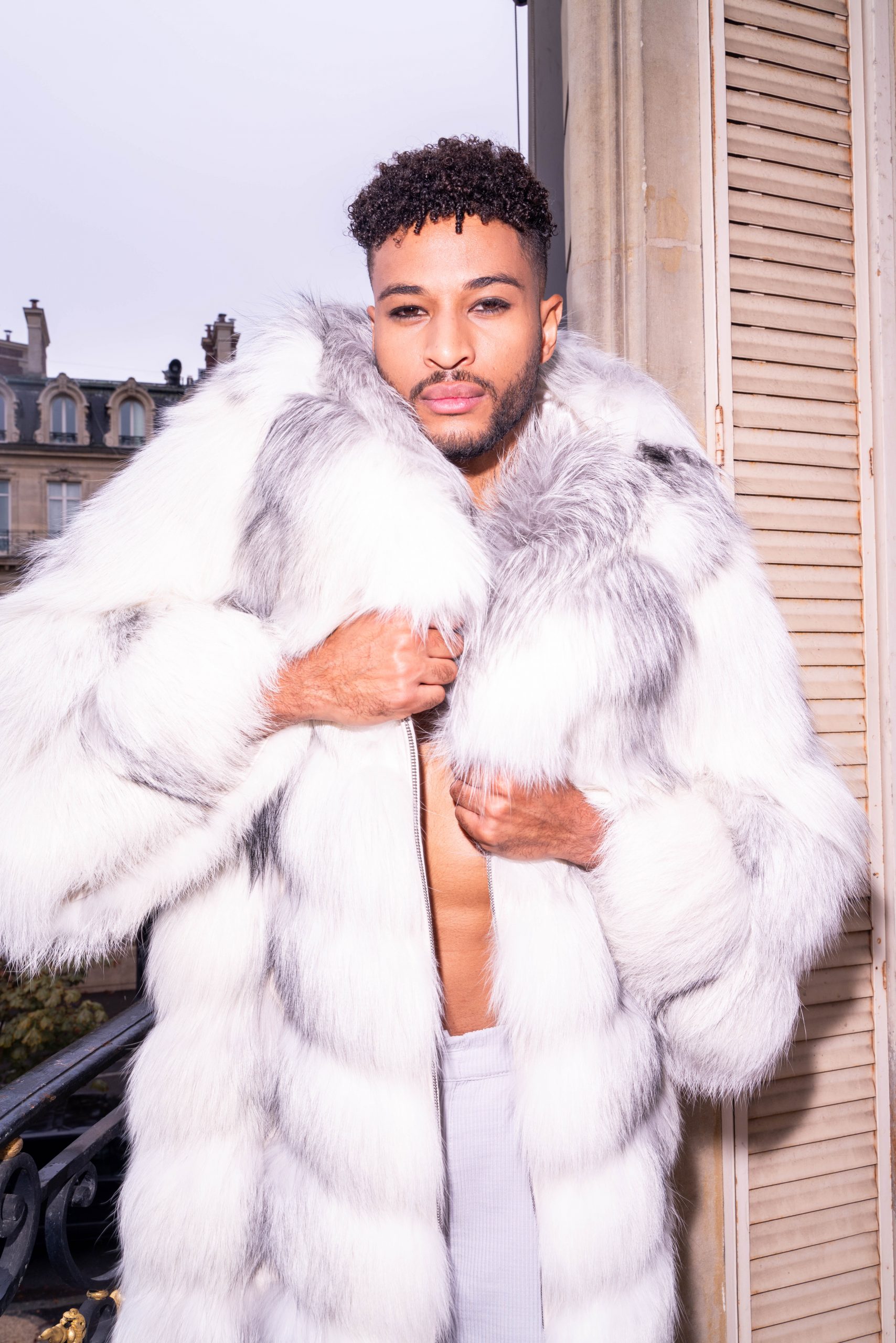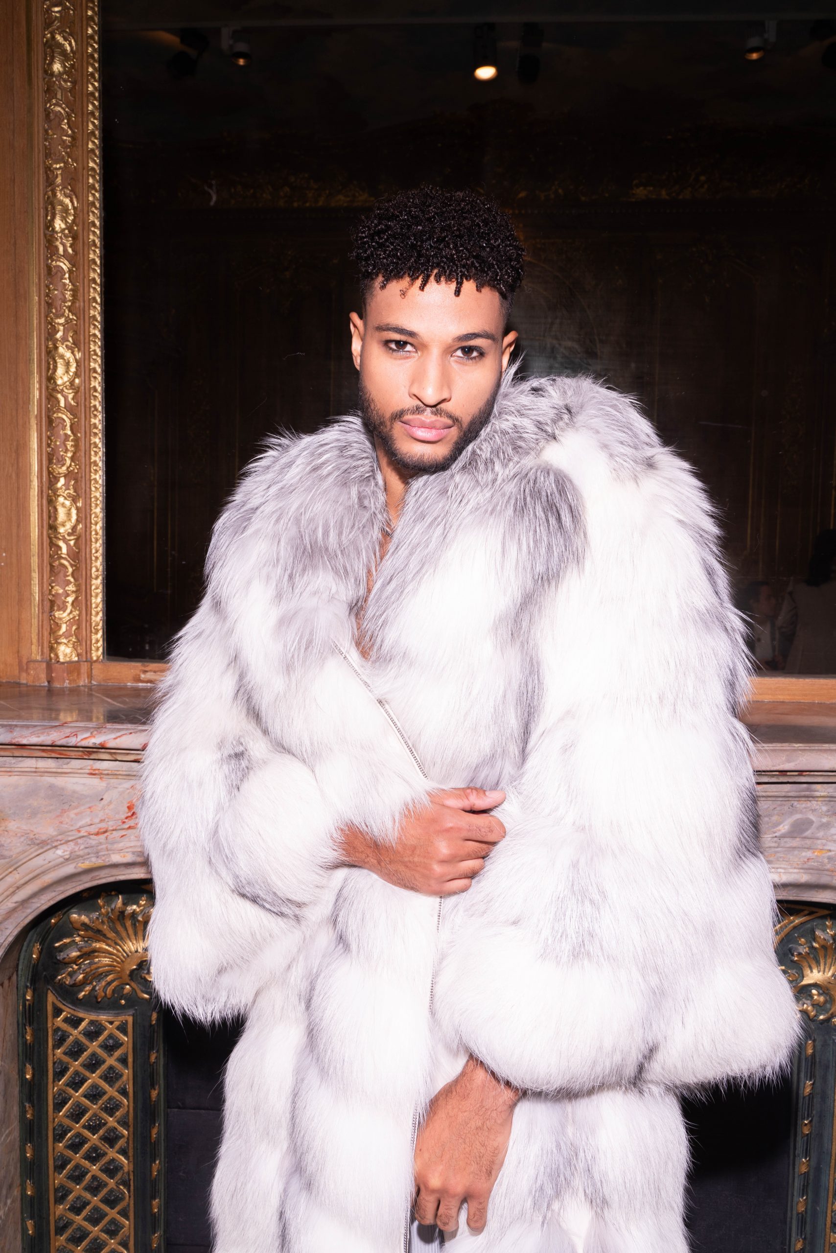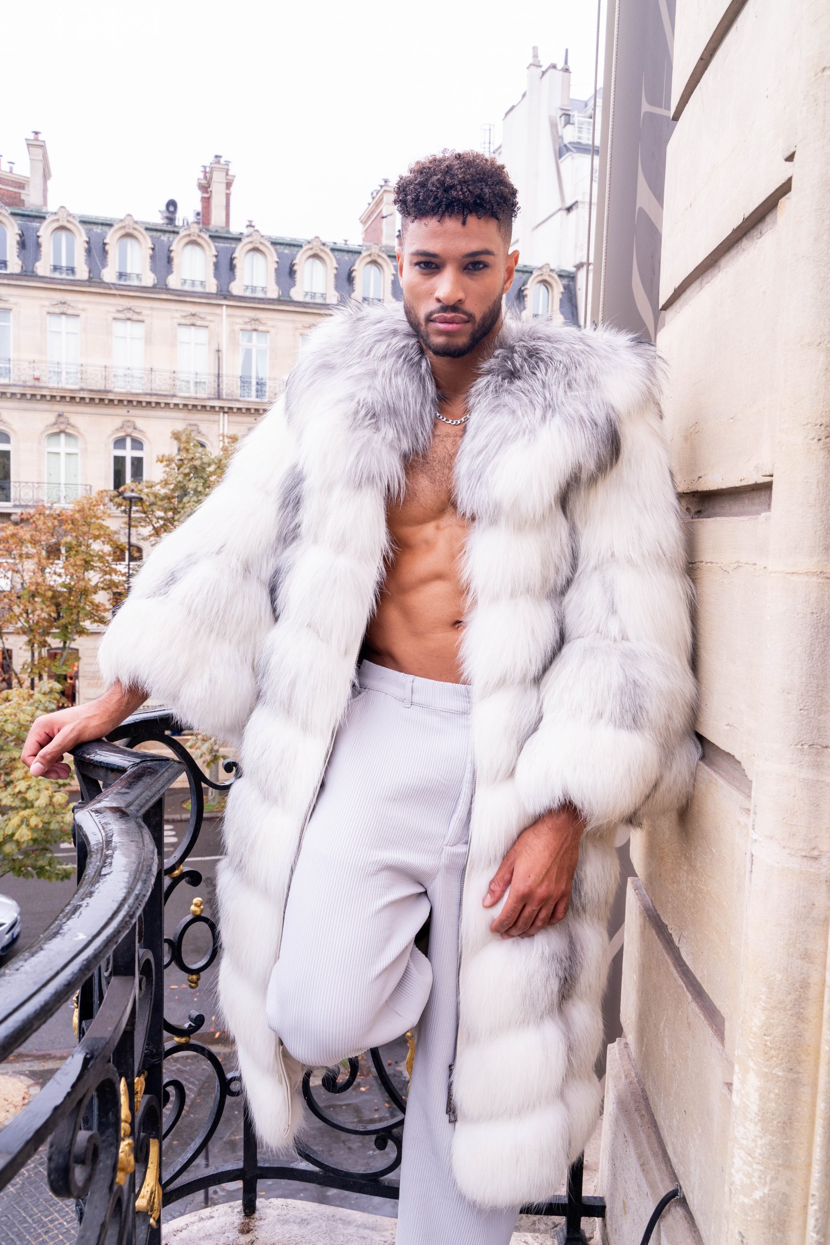 Dex arctic fox fur coat with hood and removable sleeves. A luxurious and versatile piece from "The Poison Garden" collection for men.